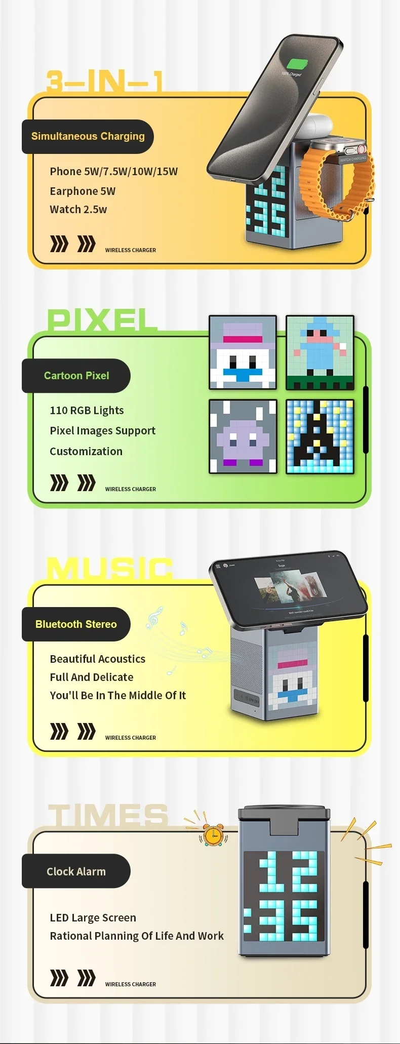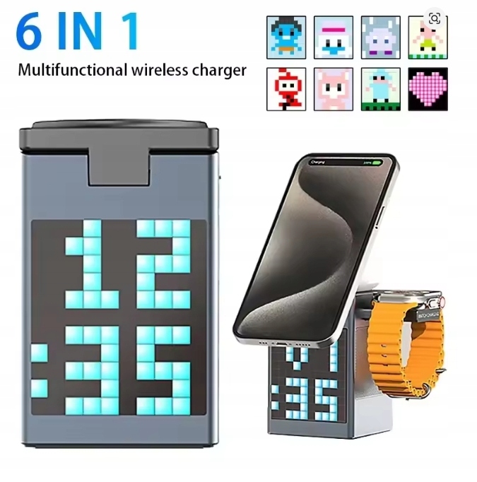 Bezprzewodowa ładowarka, budzik, zegar, ekskluzywny design, funkcja głośnika Bluetooth,.